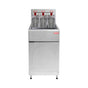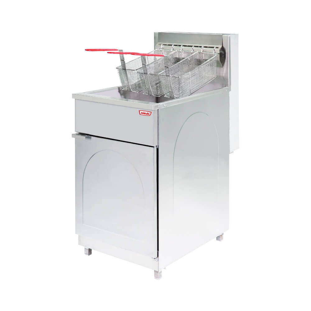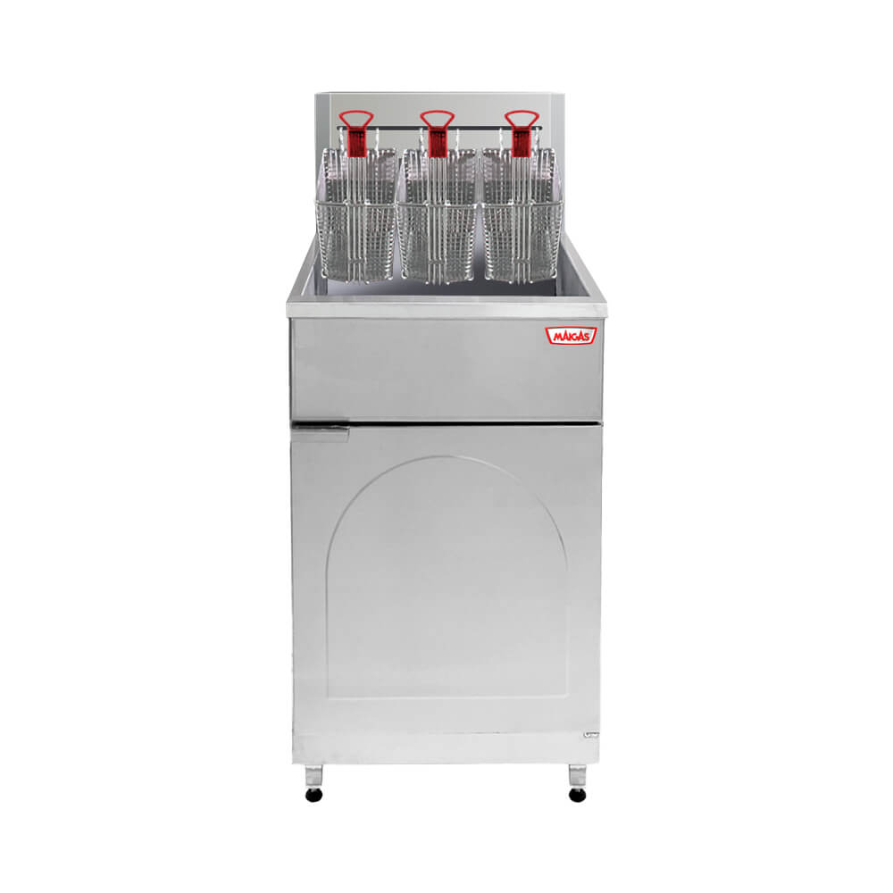Freidora fabricada íntegramente en acero inoxidable. Es un producto de funcionamiento a gas con alto rendimiento y bajo consumo. Es utilizada comunmente en cocinas y restaurantes de comida rápida.Contiene tres canastillos de acero inoxidable con una capacidad úl total de 7.3Kg. (Referencia papas congeladas prefritas).Nota: La cuba posee marca de nivel máximo y mínimo para el llenado correcto de la can dad de aceite. Además, la cuba considera un excedente de seguridad para evitar rebalses, cuando se introduce los canastillos con alimentos para freír.Fabricada en acero inoxidable. Patas con regulación de altura. 5 Quemadores de aluminio